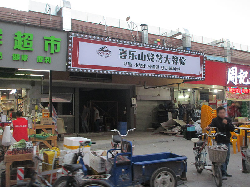 商业街一号楼嘉佳生鲜超市旁新装的这家店招牌看到了,也是做烧烤的,看来这一列中间的店火起来成行成市,会传染了,吸引类似的店开到此列 这一排的主题真是烧烤啤酒宵夜大排档了 |