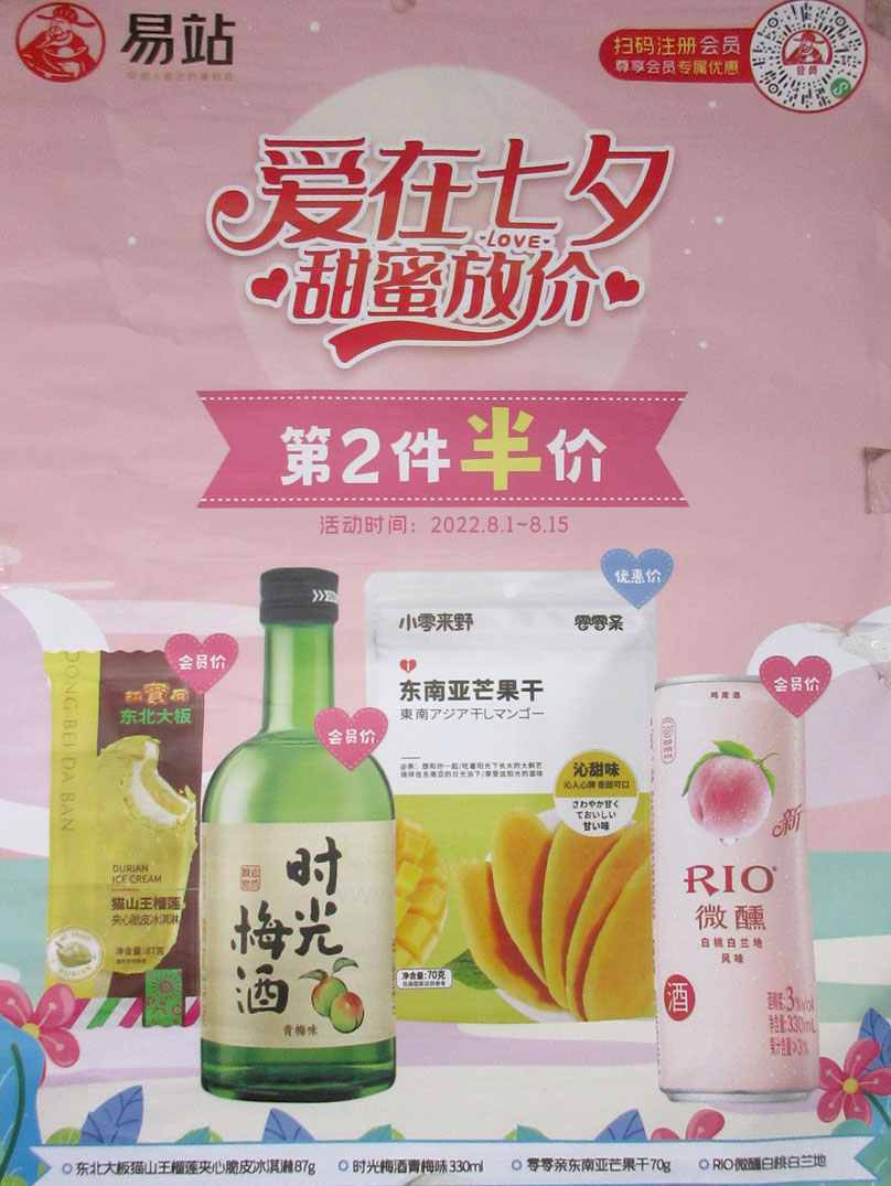 南商街三号楼东-易站便利店 七夕活动 第2件半价 时间:2022.8.1-8.15 另有东北大板,时光梅酒,RIO微醺专门会员价 芒果干优惠价