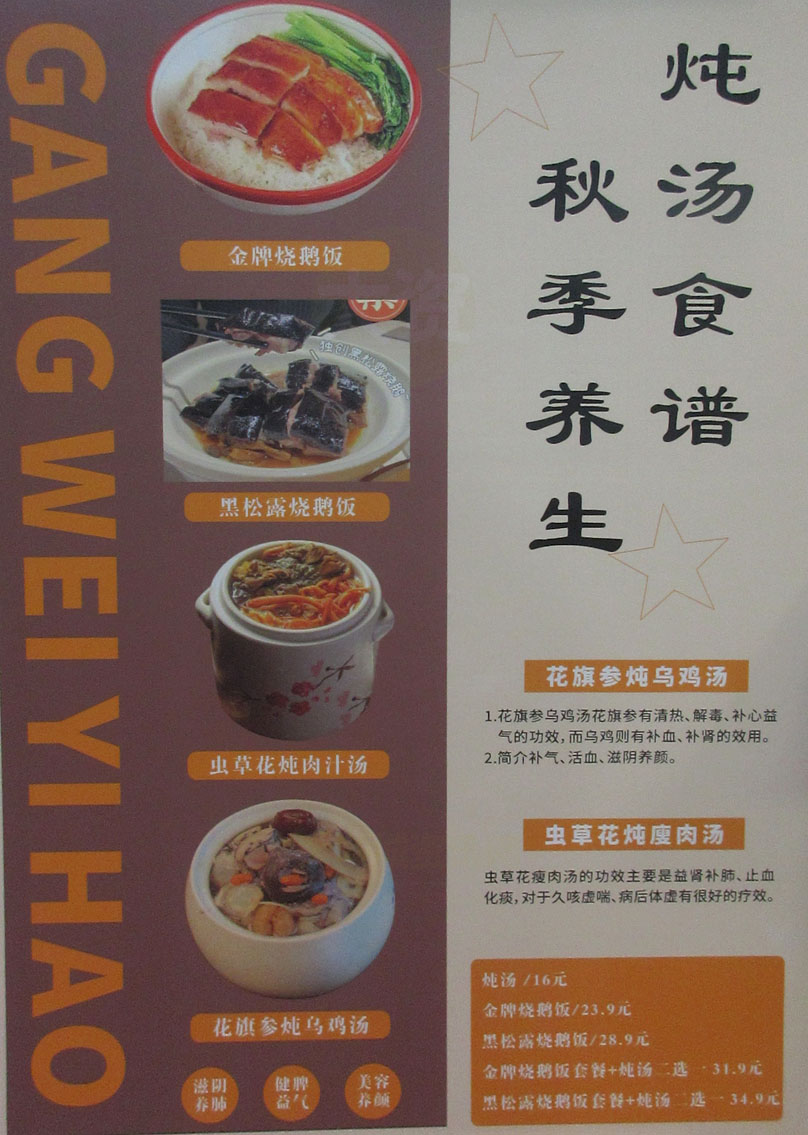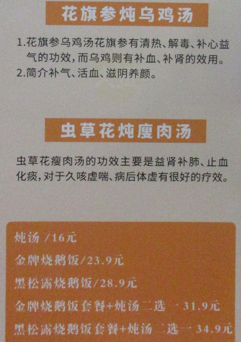 | 南商街十号楼西列中-港味壹号茶餐厅 秋季养生,炖汤食谱:花旗参炖乌鸡汤,虫草花炖瘦肉汤,金牌烧鹅饭,黑松露烧鹅饭 | ||||||