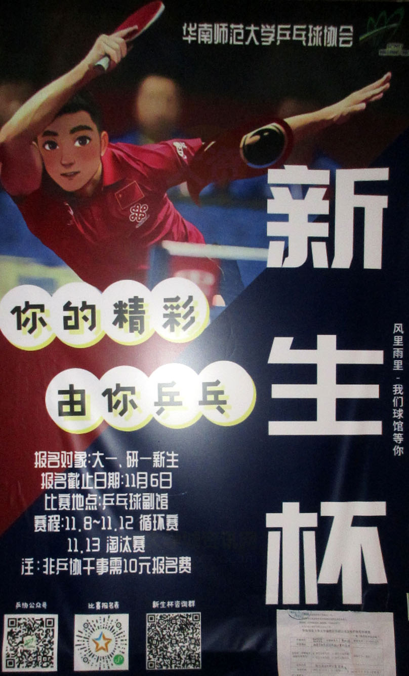 华师乒协 新生杯 报名对象:大一研一新生 截止日期11月6日 赛程11.8-11.12循环赛11.1
