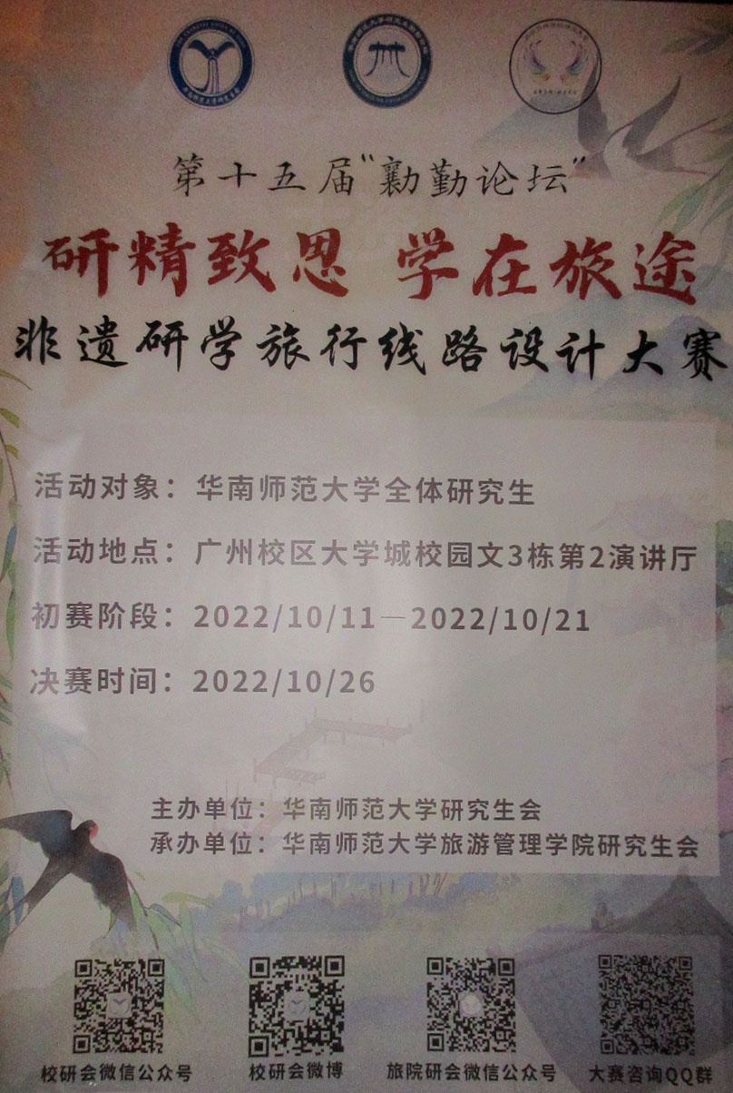 华师第十五届勷勤论坛·非遗研学旅行线路设计大赛 面向华师全体研究生 地点:教学区文3栋第2演讲厅 初赛2022.10.11-10.21 决赛2022.10.26