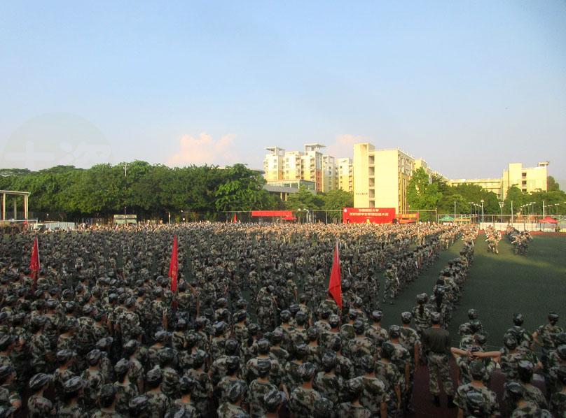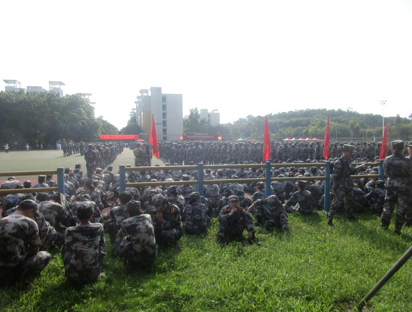 军训检阅在早上8点半左右开始,天气太阳光已经比较照射,略带热感 下面是昨天傍午彩排时的分列式部分,天色和温度感觉都较适中