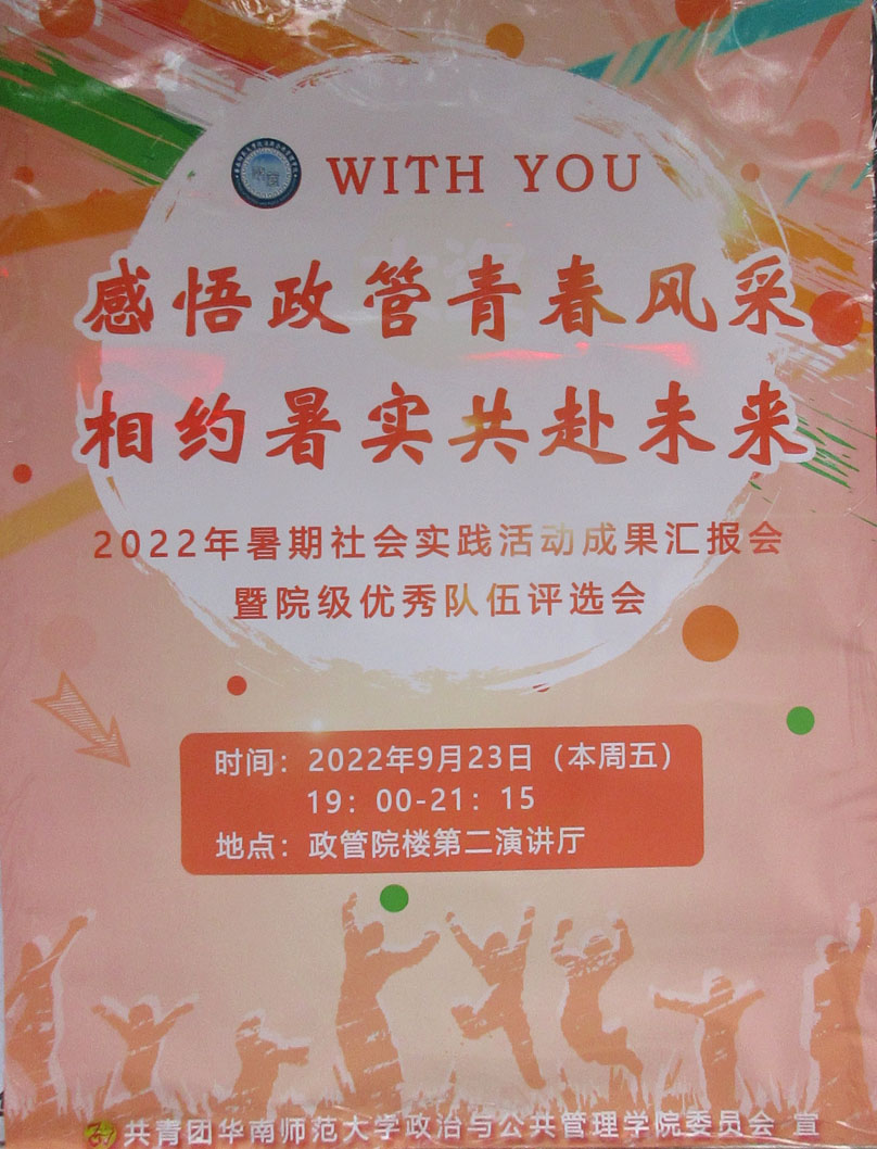 华师政管学院·2022年暑期社会实践活动成果汇报会暨院级优秀队伍评选会 2022年9月23日周五晚19点-21点15分 政管学院第二演讲厅
