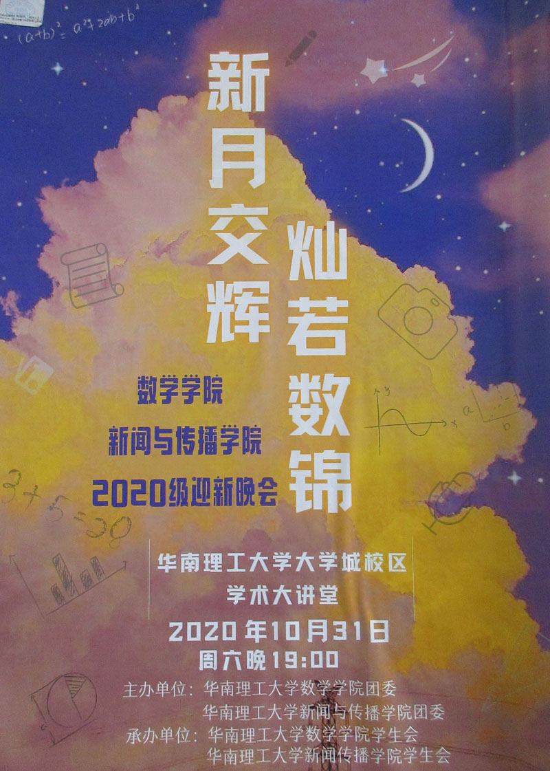 | 数学学院&新闻学院2020级迎新晚会预告 2020年10月31日周六晚学术大讲堂 | ||||||