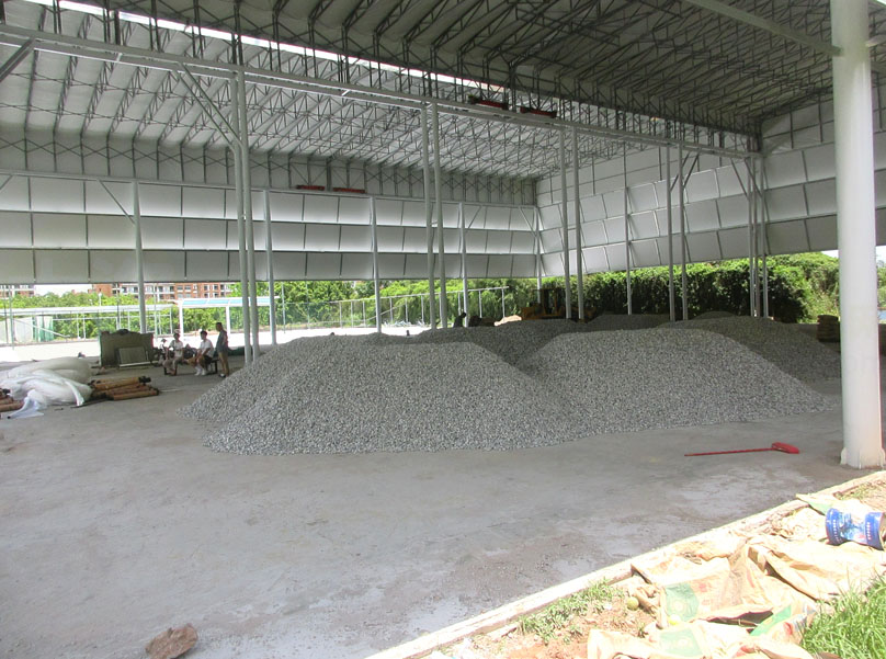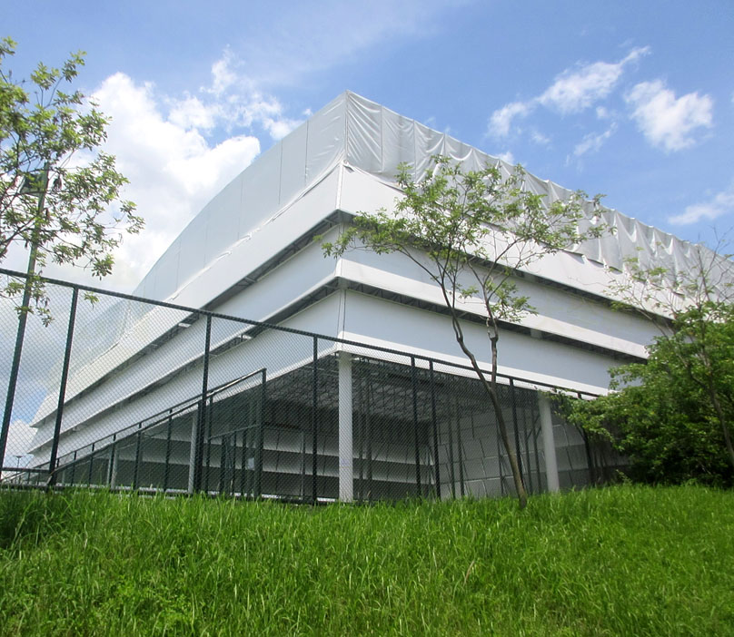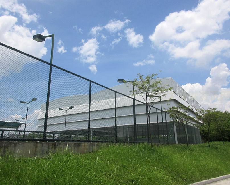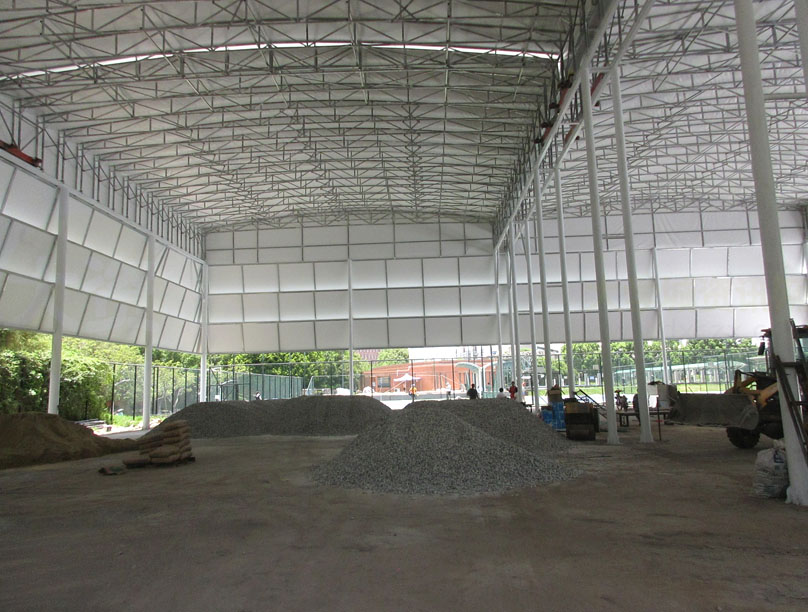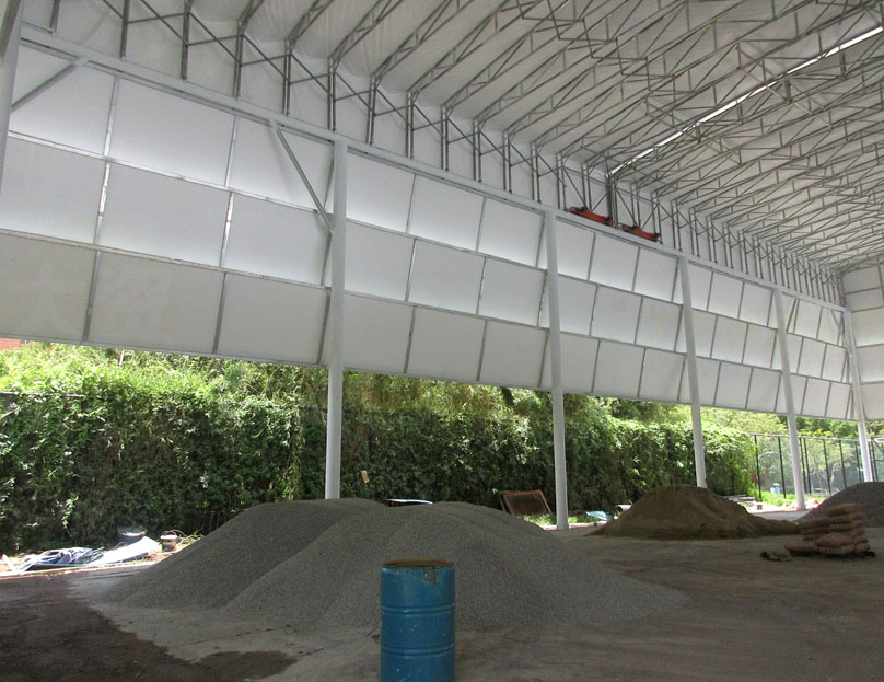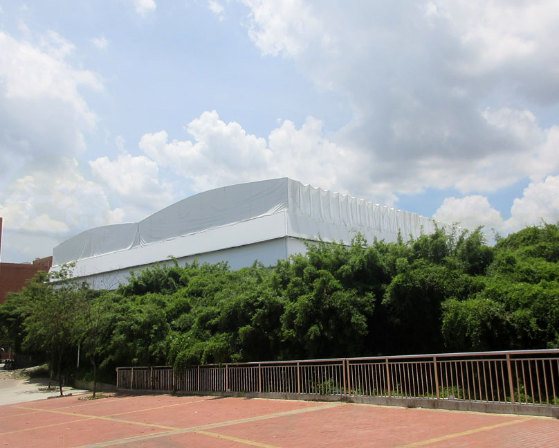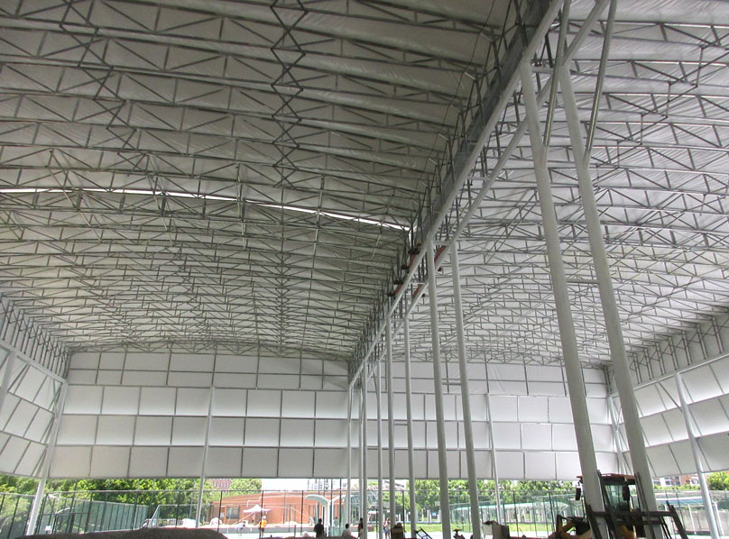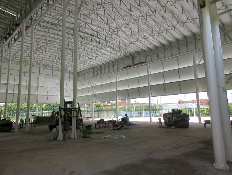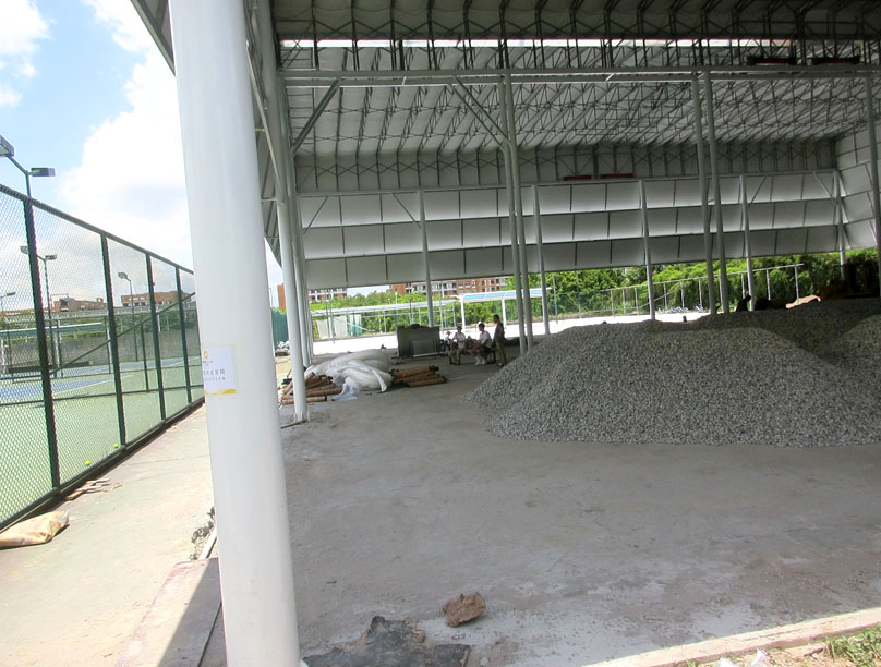看着两个顶棚各两边的滑轮及构件,是不是有点不太经得起日常频繁的开合?所以这两个场弄好后,应该大多数情况下,都是会保持合上顶棚或敞开露天?按说应该会是前面合上的状态,不然还专门加个顶棚做啥,就是为了遮挡太阳或下雨等,毕竟广州5、6、7、8月份这样的夏天季节,那个晒是相当有热度的,所以里面晚上或较暗的时候,应该还要配上灯光照明吧;另外,看着,这种顶棚是帆布式的像,不知道遮挡风雨的经受程度几何,阳光耐晒程度几何,希望不会太容易出现漏水或损坏