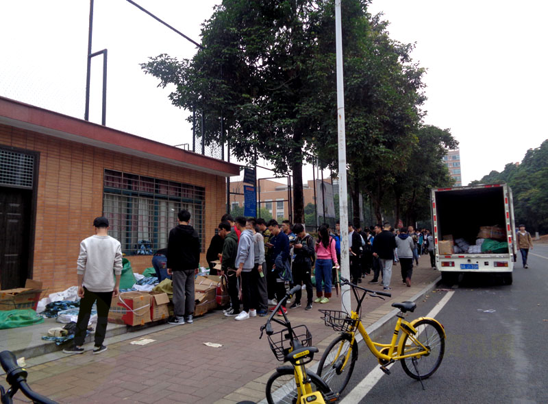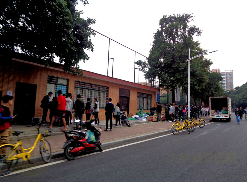 华工2017级新生正在生活区足球场器材室旁排队购买军训服套装