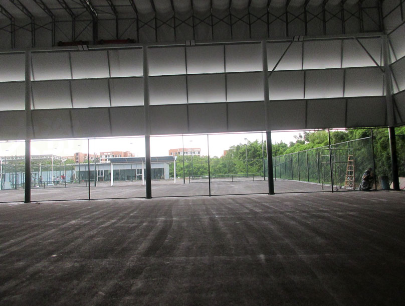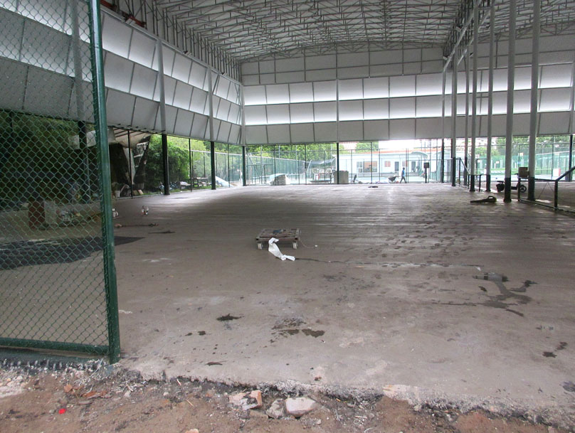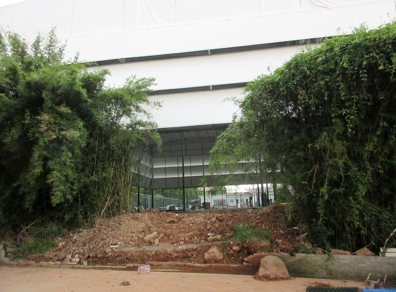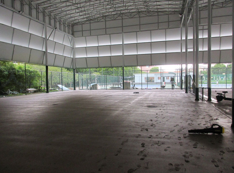 又一个月过去了,华工网球场可开合顶棚加建及场地升级改造工程,看到似乎真的进入到完成的尾声了,地板也已经做好水泥砂浆层,场地周围的围栏网也已装上,并且照明灯也安装好,听说还要半个月即9月初就能完全弄好 不过看到靠近中环北天桥引道这边施工需要开的出入口似乎完工后要重新围合上和种回竹子等植物,其实这边修个台阶开个不用太大平时可锁上或关着的门是不是挺方便学生从这边进出网球场