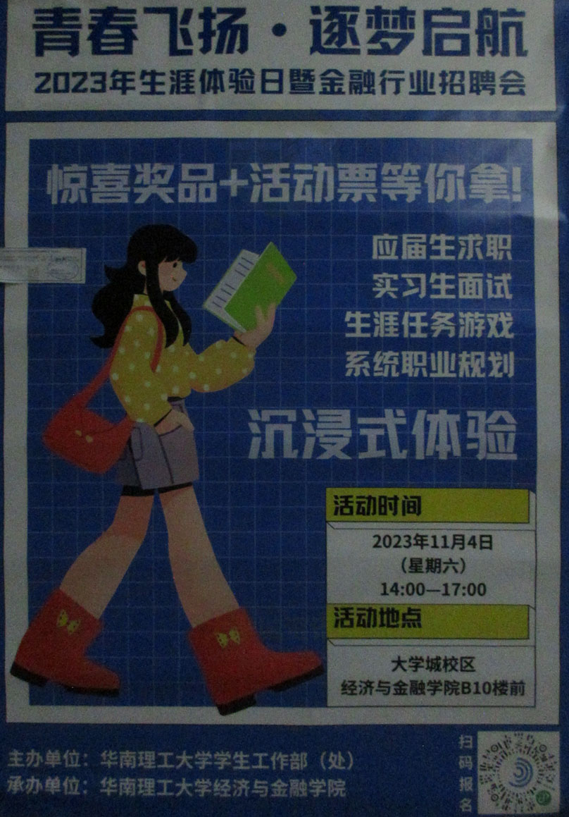 青春飞扬·逐梦启航-华工2023年生涯体验日暨金融行业招聘会 2023年11月4日周六下午14点-17点 教学区经金学院B10栋前 听说还有奖品和活动票
