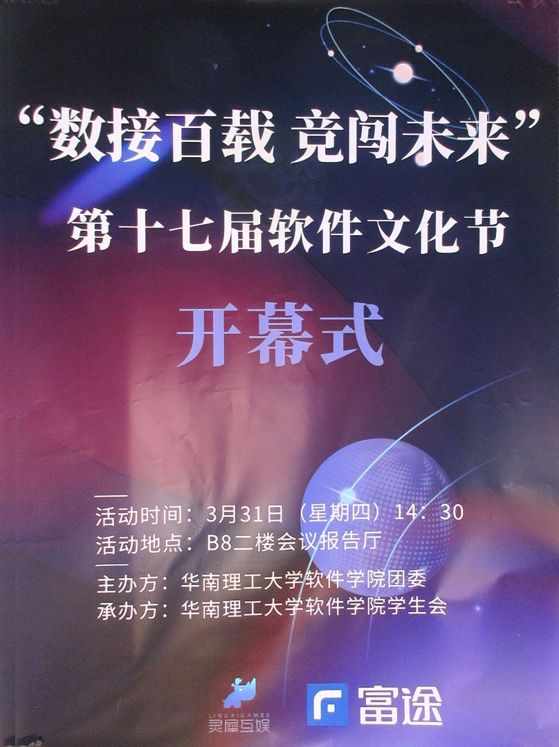 华工 “数接百载竞闯未来”第十七届软件文化节开幕式 3月31日(周四)14点30分 教学区B8二楼会议报告厅 |
