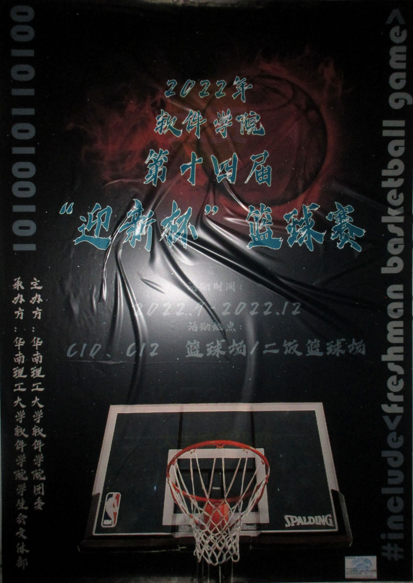 | 华工2022年软件学院第十四届“迎新杯”篮球赛 2022.09-2022.12 地点:C10、C12篮球场,二饭篮球场 | ||||||
