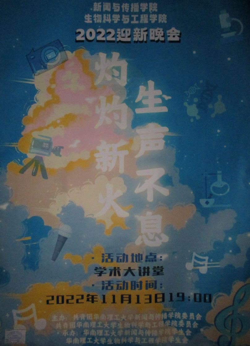 新闻与传播学院&生物科学与工程学院 联合2022迎新晚会 2022.11.13周日晚19点 教学区学术大讲堂 |