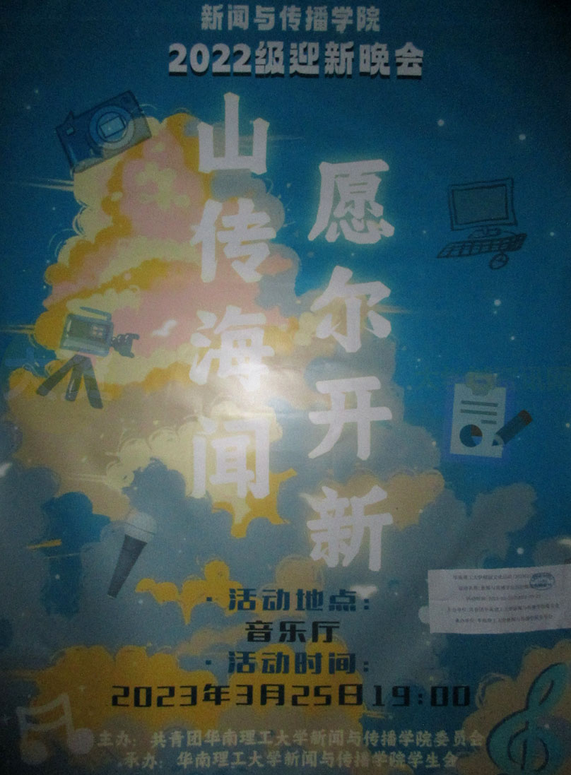 华工新传学院2022级迎新晚会 2023.03.25周六晚19点 教学区音乐厅 |