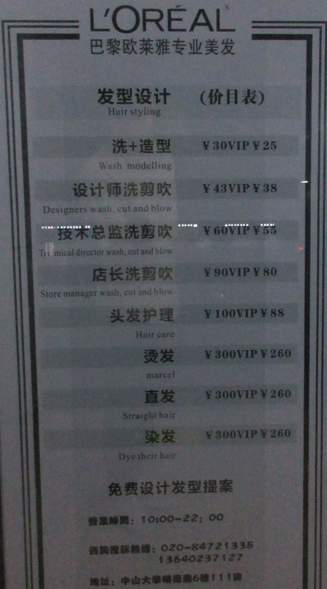 中大生活区_明德园6栋北列西 欧莱雅美发店&发型设计价目表