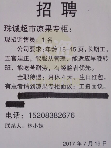 珠诚超市凉果专柜现招聘销售员1名