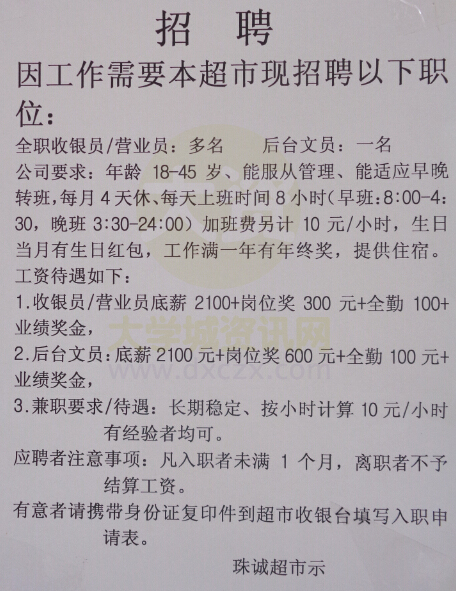 珠诚超市招聘全职收银员、营业员多名,后台文员一名