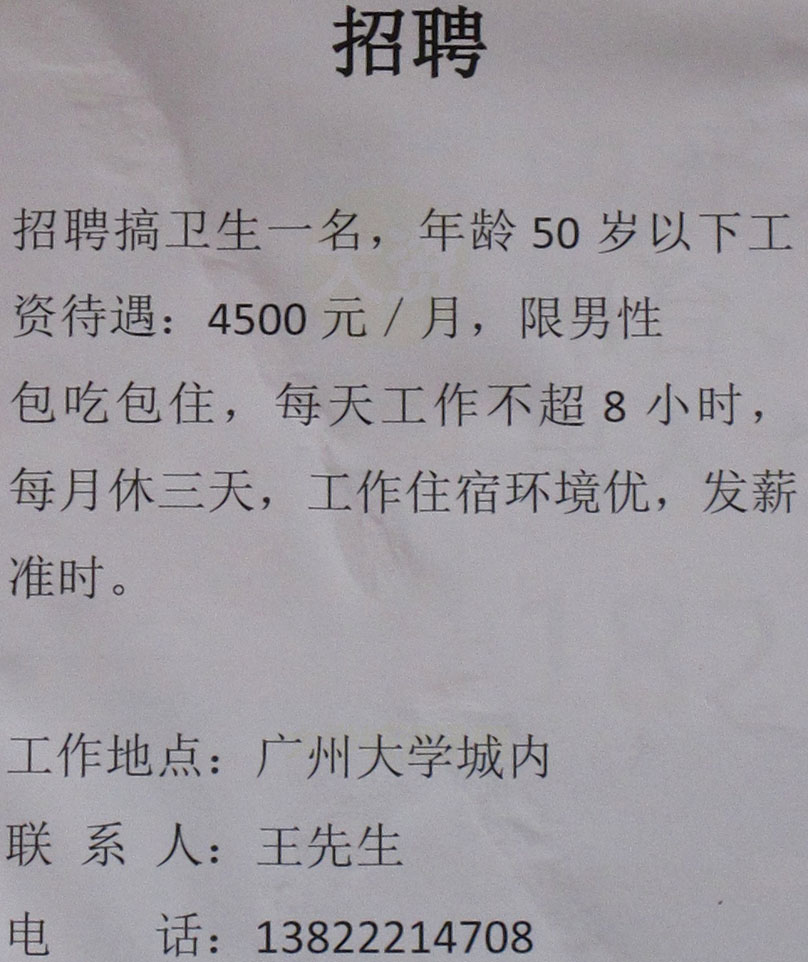 招聘搞卫生一名,年龄50岁以下 工资待遇4500元每月,限男性 包吃包住,每天工作不超8小时,月休3天 联系13822214708王生