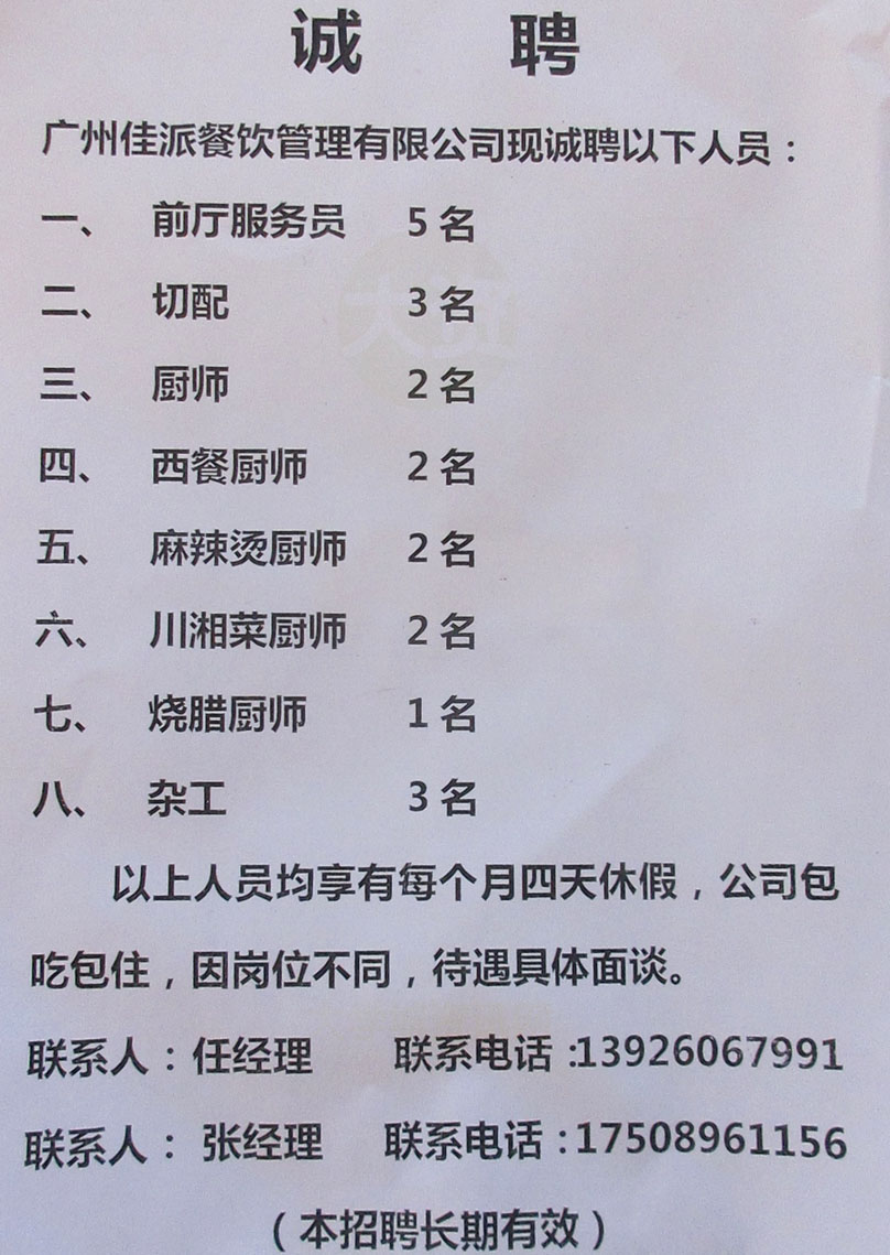 广州佳派餐饮管理有限公司诚聘 前厅服务员,切配,各类厨师,杂工