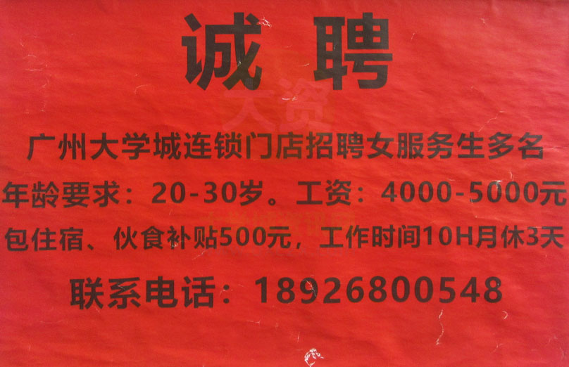 广州大学城某连锁门店招聘女服务员多名 要求20-30岁 薪资4000-5000元 包食宿 月休3天 联系18926800548