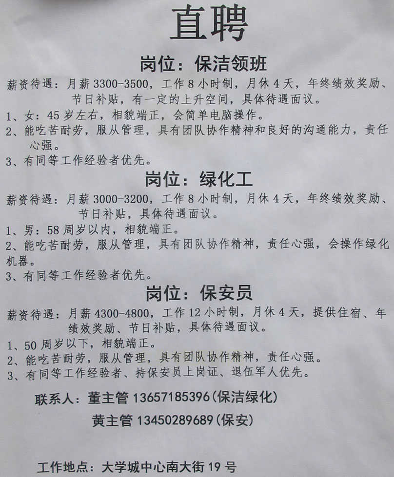 大学城南区·中心南大街19号 招聘保洁领班、绿化工、保安员 联系13657185396保洁绿化 13450289689保安