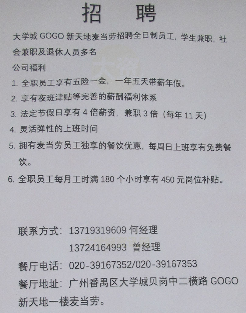 大学城GOGO新天地麦当劳店招聘全日制员工 学生兼职 社会兼职及退休人员多名 联系13719319609何经理