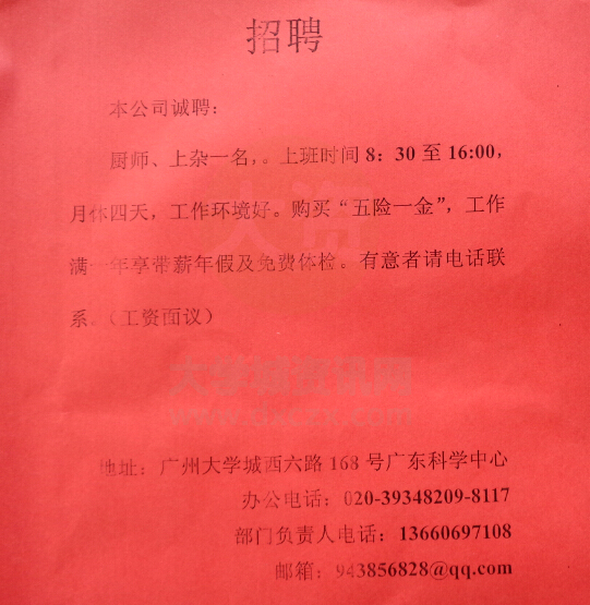 广东科学中心诚聘厨师、上杂一名