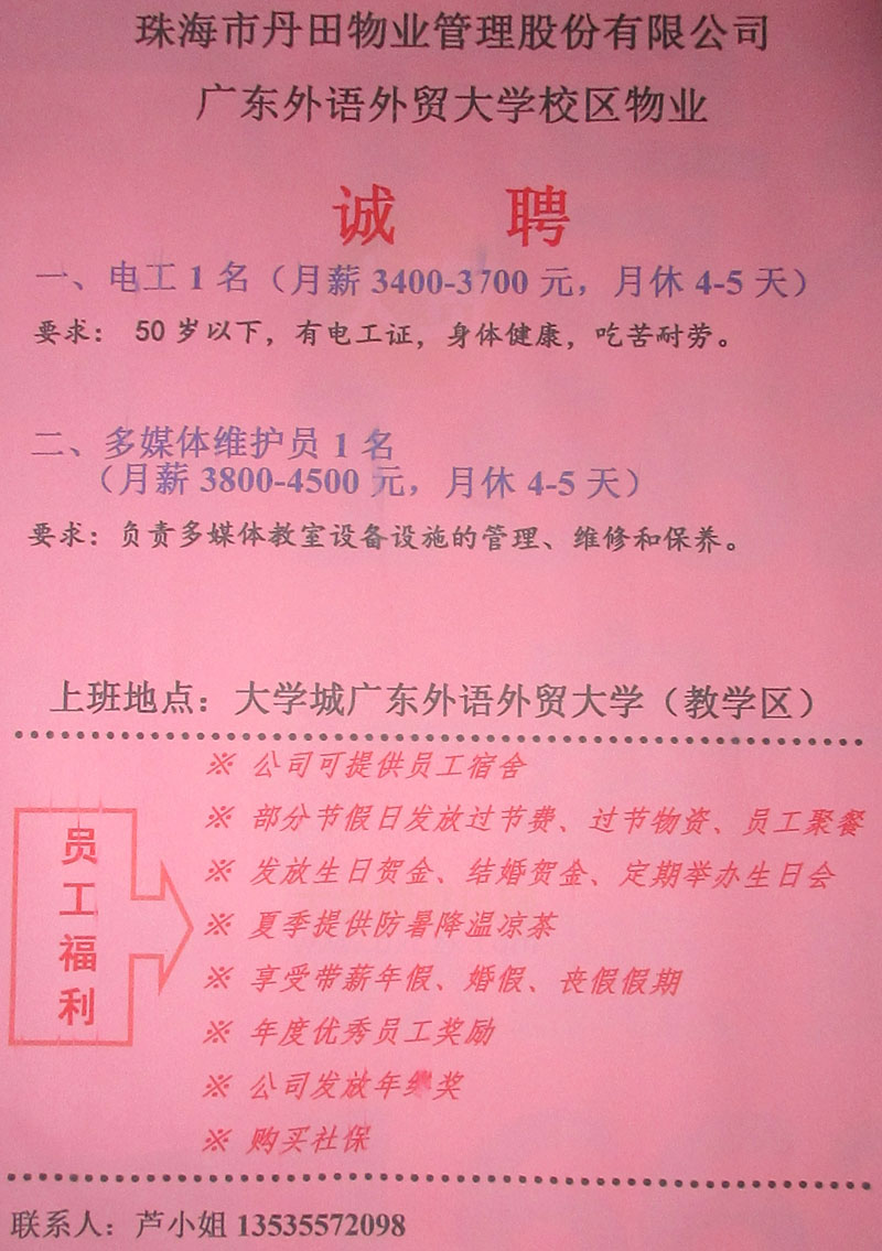广外物业诚聘电工(月薪3400-3700)、多媒体维护员(月薪3800-4500)各1名,月休4-5天