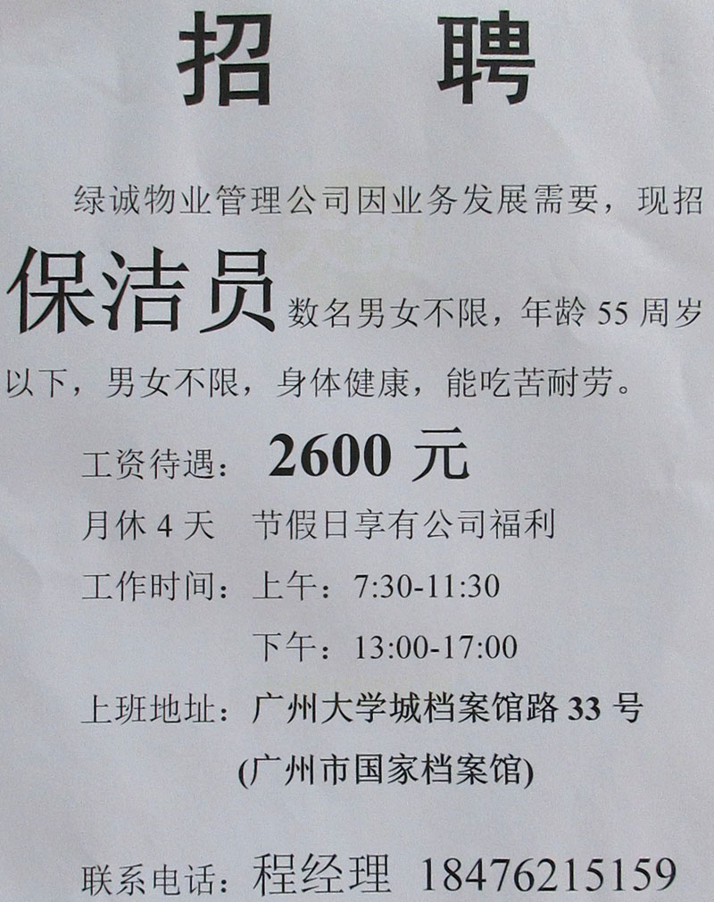 大学城档案馆(绿诚物业公司)现招聘保洁员数名,男女不限,工资待遇2600元