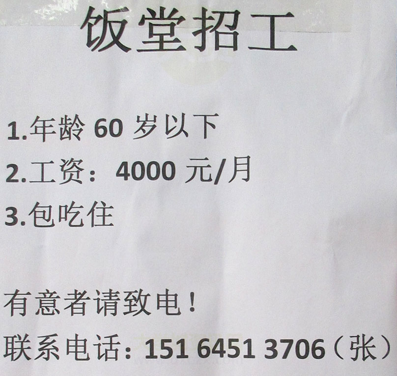 【饭堂招工】1.年龄60岁以下 2.工资4000元每月 3.包吃住 有意者请致电15164513706